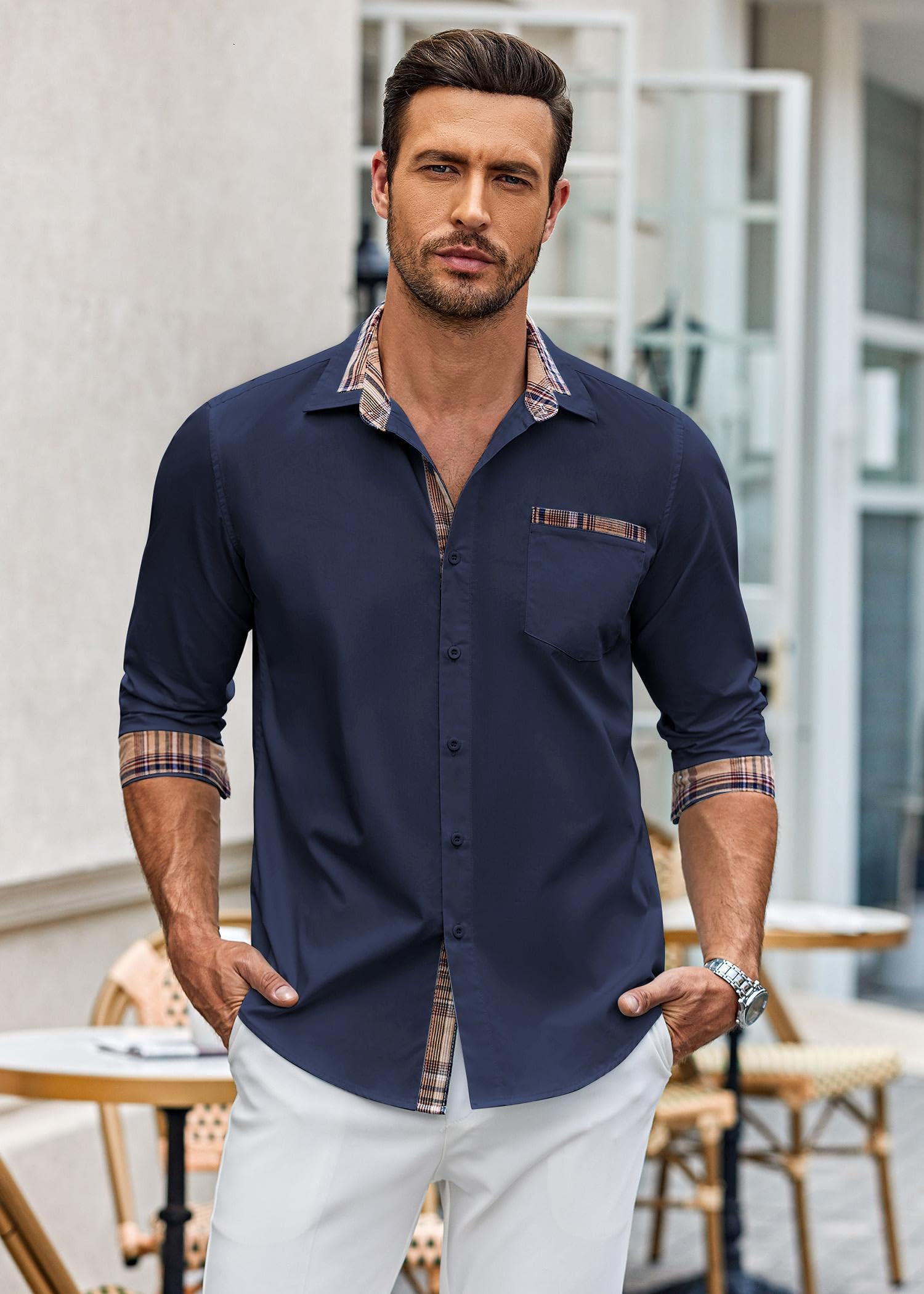 Classic Design: Men's long sleeve formal shirt with plaid collar and cuffs, adding a touch of playfulness to the classic style. The shirt comes with a chest pocket and button closure, which is a must-have item for creating an urban fashion look.
