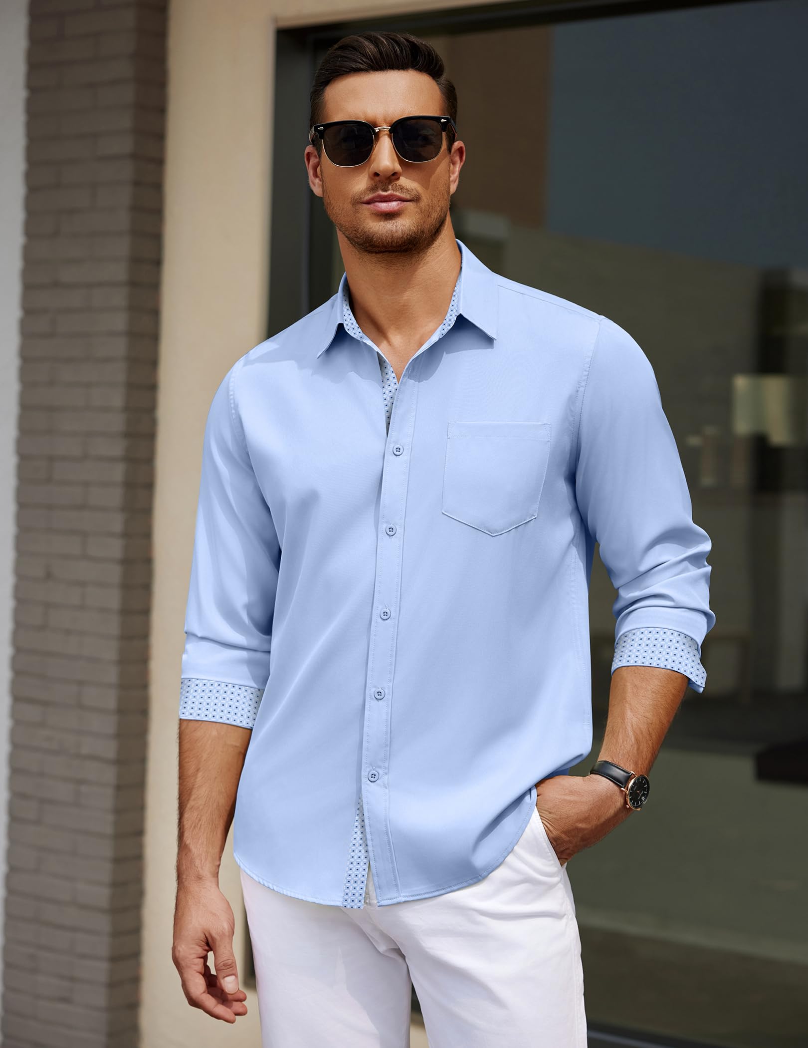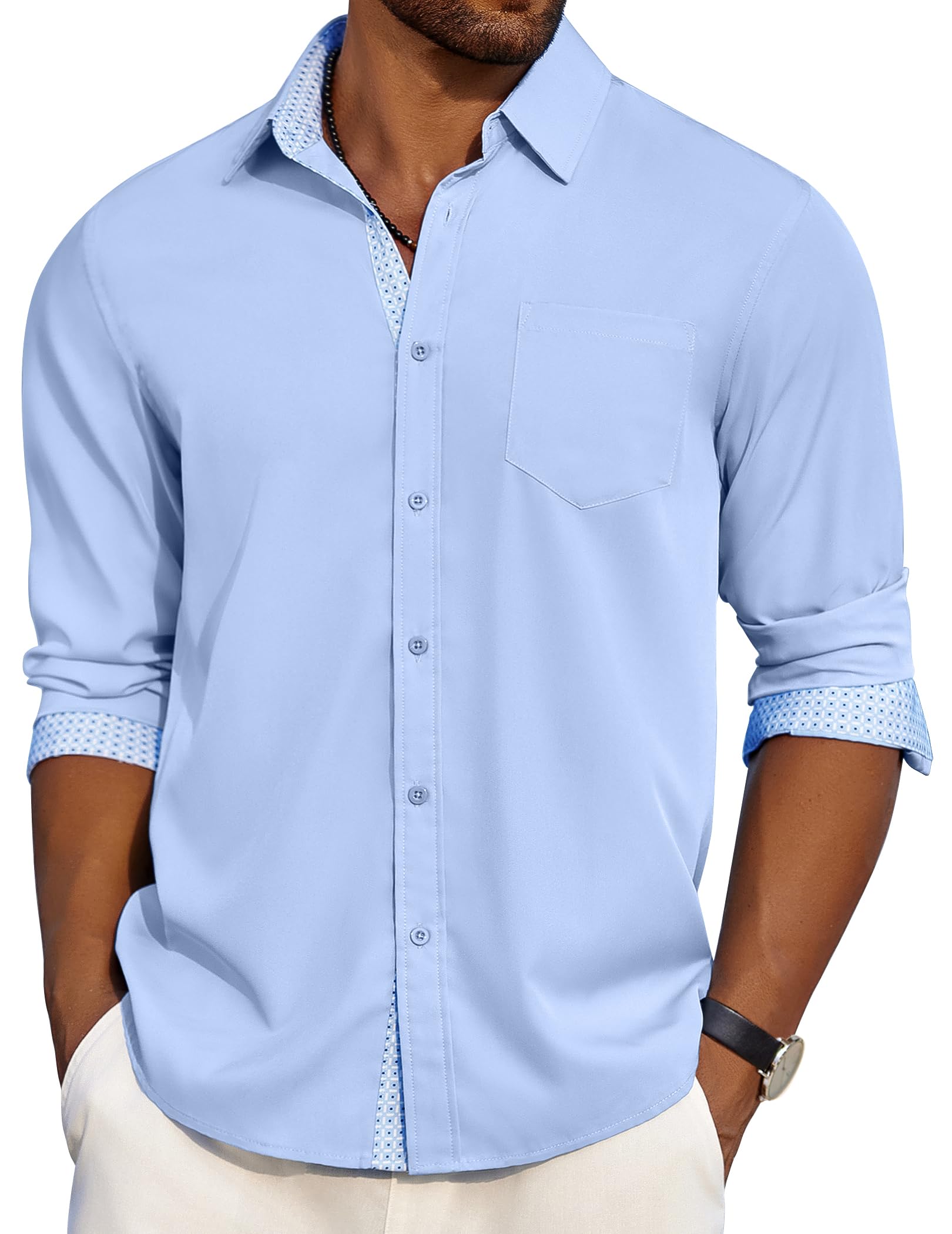 Stylish Contrast Design: This dress shirt features a stylish contrast design on the collar and cuffs, which will add a bright highlight to any look. For an even more stylish look, simply roll up the cuffs to reveal the contrast lining.